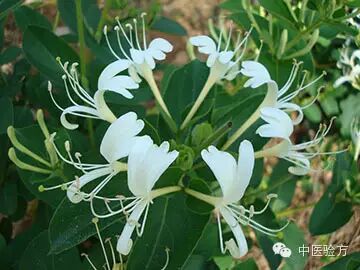 4、金银花治温病发热,热毒血痢,痈疡,肿毒,瘰疬,痔漏。气清香,味淡、微苦。由于忍冬花初开为白色,后转为黄色,因此得名金银花。