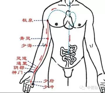 “心系”直行的脉:上行于肺部,再向下出于腋窝部(极泉),沿着上臂内侧后缘,行于手太阴经和手厥阴经的后面,到达肘窝,沿前臂内侧后缘,至掌后豌豆骨部,进入掌内。沿小指内侧至末端(少冲),与手太阳小肠经相接。